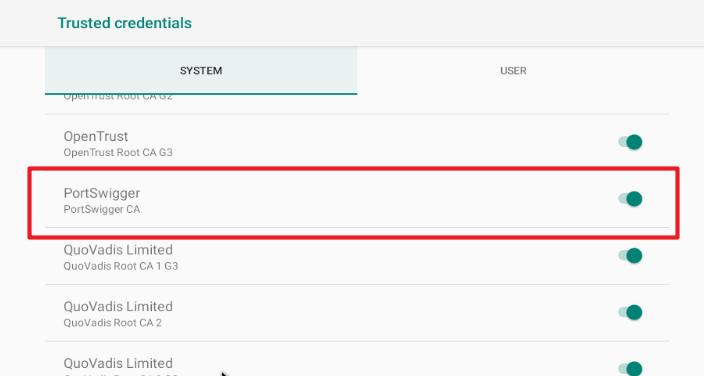 If we go to Settings on the Android machine and look for the “Trusted credentials” section we can see how our certificate has been installed as the system CA: