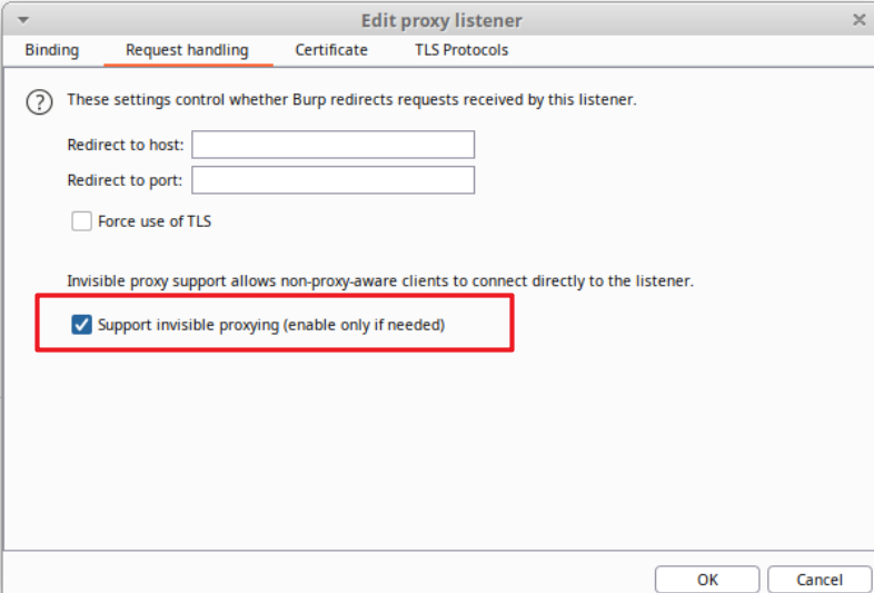 • In the “Request handling” tab of the same window enable the option “Support invisible proxying (enable only if needed)”.